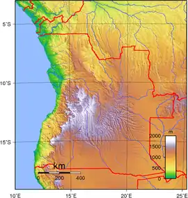آنگولا کشوری بزرگ در جنوب غرب آفریقا و در کناره جنوبی اقیانوس اطلس، بین نامیبیا و جمهوری دموکراتیک کنگو واقع شدهاست. میزان بارش سالانه از ۲۵ سانتیمتر در شمال، تا ۶۰ سانتیمتر در جنوب این کشور، متغیر است. پستترین نقطه آنگولا در ساحل اقیانوس اطلس همسطح آبهای آزاد دنیاست و بلندترین نقطه آن مورو دموکو با ۲۶۲۰ متر ارتفاع است. طول خطوط ساحلی آنگولا با اقیانوس اطلس از سمت غرب به ۱۶۰۰ کیلومتر میرسد.