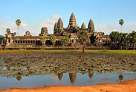 معبد انگکور وات در اوایل سدهٔ دوازدهم برای شاه سوریاوارمان دوم ساخته شد و سپس به ویشنو خدای هندو اهدا شد. معبد آنگکور وات بزرگترین معبد تک مذهبی در جهان است. متن صفحه. این ساختمان سه طبقه دارای یک ردیف حصارهای راست گوشه و مستطیلی است. برجهای آن مانند غنچههای نیلوفر آبی و ارتفاعشان ۶۰ متر است.[6]