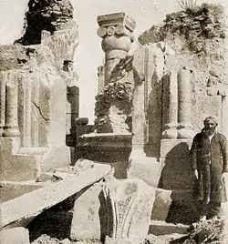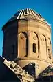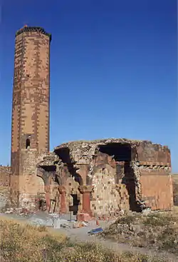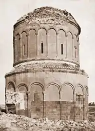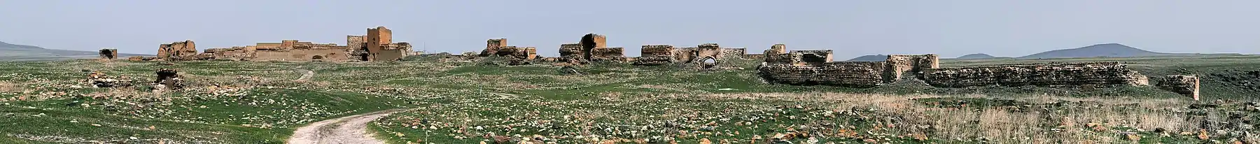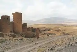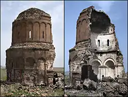 ![]() The ruins of Ani as seen from the Armenian side. The کلیسای جامع آنی with its missing dome is seen on the left, the half-collapsed Church of the Holy Redeemer on the right. | |