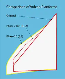 ۱۵ فروند اول بی.۱ دارای موتور الیمپوس ۱۰۱ بود. تصمیم برای تولید ورژن بی.۲ والکان در مه ۱۹۵۶ گرفته شد. پیشبینی میشد که نخستین ورژن بی.۲ تقریباً ۴۵مین فروند از ۹۹ فروند سفارش داده شده باشد.[24] علاوه بر توانایی پرواز در ارتفاع بالاتری از هدفها گمان میرفت که این ورژن میتواند با تجهیزات سوختگیری در هوا انعطافپذیری عملیاتی بیشتری داشته باشد.[25] پیچیدگی فزایندهٔ دفاع هوایی شوروی سازندگان را بر آن داشت که والکان را مجهز به تجهیزات پادکار الکترونیکی کنند و آسیب پذیری آن را با تجهیز آن به موشک بازدارنده بلو استیل که در آن زمان در حال ساخت بود کاهش دهند.[26] پیشنمونهٔ دوم والکان با شماره سریال VX777 با بال مرحلهٔ دوم پهنتر و نازکتر بازسازی شد و موتور الیمپوس ۱۰۲ برای آن در نظر گرفته شد. این پیشنمونه در اوت ۱۹۵۷ به پرواز درآمد.[27] برنامه این بود که از شانزدهمین هواپیمای تولیدی به بعد همهٔ والکانها مجهز به تجهیزات سوختگیری هوایی باشند.[28]