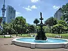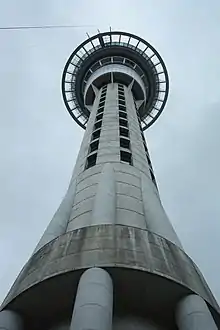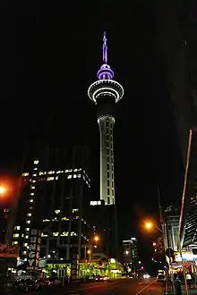 برج آسمان (Sky Tower) با ۳۲۸ متر ارتفاع بلندترین بنای ساختمانی این شهر و به عبارتی نماد این شهر میباشد. به شعاع ۱۰ چهارراه بزرگ و چندین خیابان شلوغ مرکزی ترین نقطه شهر، شهر آسمان (Sky City) گفته می شود که شامل بیش از ده برج بلند بانکها و شرکت های بزرگ است.