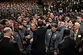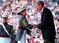 جرج ه. و. بوش، رئیس جمهور وقت آمریکا در حال اعطای درجه نظامی به یکی از دانشآموختگان زن مدرسه نظامی وست پوینت - سال ۱۹۹۱