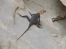 [1]آگامای صخره ای سر زرد روی صخره های آهکی با شکاف های زیاد، برآمدگی ها یا دیوارهای صخرهای، دیوار خانه ها و دیوارهای کاه گلی زندگی میکنند.