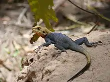 این خزنده اغلب در گرمای روز دیده میشود.در فصل تولیدمثل نرها علائم چشمگیر خود را توسعه میدهند و سر، گردن و حتی دم به رنگ نارنجی روشن و بدن به رنگ آبی تیره درمیآید.نرها در فصلهای دیگر به رنگ قهوهای ساده هستند. مادهها و کمسنها اغلب به صورت مرموز و پنهان هستند.این خزنده میتواند از صخرهها و دیوارها بالا رود و تغذیه آن حشرات است.