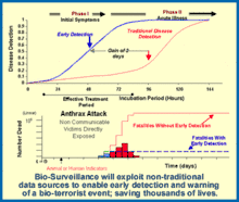 پروژه نظارت زیستسنجشی برای پیشبینی و پاسخ به بیوتروریسم طراحی شده بود. نظارت زیستسنجشی با نظارت بر منابع داده غیر مرسوم، مانند گونههای سنتینل (حساس)، نشانگرهای رفتاری، و دادههای پیش از تشخیص پزشکی انجام میشد. نظارت زیستسنجشی، مدلهای بیماریهای موجود، شناخت نشانههای نخستین وضعیت غیرعادی سلامت، و دادهکاوی پایگاه دادههای موجود برای تعیین با ارزشترین نشانههای نخستین وضعیت غیرعادی سلامت را بهبود میداد.[38]