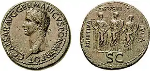افتخار از سکههایی از نوعی که قبلاً صادر نشده بود، به تصویر کشیدن تصاویر کالیگولا و خواهرانش در چهرههای مخالف؛ نام آنها اضافه میشود.