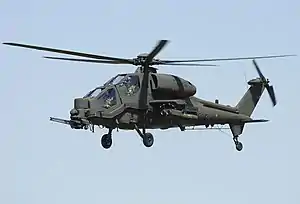 در بالگرد تهاجمی کلاه خدمه دارای نمایشگر و چشمی مخصوص و سنسوری است که به کمک آن خدمه میتوانند تنها با نگاه کردن به هدف، توپ را به سمت آن بچرخانند و هدف گیری کنند این بالگرد دارای یک توپ گاتلینگ ۳ لول ۲۰ میلیمتری آمریکایی ام ۱۹۷ در دماغه و ۵۰۰ گلوله ۱۰۲×۲۰ میلیمتری برای توپ است لازم با ذکر است دارای ۸ موشک تاو است همچنین این هلیکوپتر توانایی حمل مسلسلهای بیشتر در جایگاه موشکهای خود و همینطور حمل راکت اندازهای غیر هدایت شونده را دارد. موتور این هلیکوپتر دو موتور توربوشفت Piaggio است که در ایتالیا تحت لیسانس کارخانه رولز-رویس تولید میشود و همینطور روتور این بالگرد از پنج تیغه تشکیل شدهاست. این بالگرد در عملیات سازمان ملل از سال ۱۹۹۲ تا ۱۹۹۴ در سومالی شرکت داشت