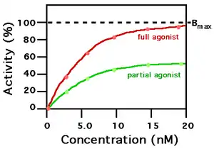 در یک منحنی دوز (غلظت) در برابر پاسخ که معمولاً سیگموئید است، آگونیست کامل اثری ماکزیمم دارد (Bmax) ولی آگونیست نسبی اثری کمتر از ماکزیمم را نشان میدهد.