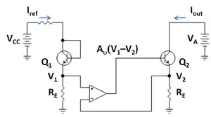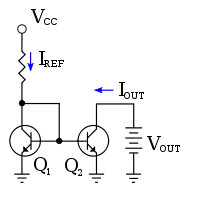 در اینجا IS جریان اشباع معکوس یا جریان مقیاس؛ VT، ولتاژ حرارتی و VA، ولتاژ ارلی است. این جریان نسبت به جریان مرجع Iref زمانی که خروجی ترانزیستور V CB = 0 V است توسط: