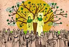 ![]() نگارهای از واقعه غدیر خم، که نزول آیه تبلیغ، در شأن آن واقعه بودهاست. | |