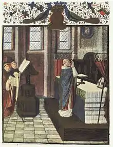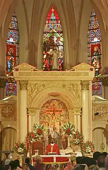 از این رو کاتولیک رومی و ارتدکس معتقدند که تثلیث مقدس واقعاً میزبان است، و آیین مقدس را در مراسمی که قبلاً به آن التار میگفتند جشن میگیرد. آیین مقدس تجدید میشود در هر زمانی قربانی بیگناه عیسی مسیح را زنده میکند، زیرا او «همان مقدس خدا» است.[8] و در نتیجه این تنها راه و درب رستگاری برای گناهان انسانی است.