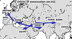 این آیین در ایران دوران ساسانیان مخصوصاً در دوره شاپور یکم و پس از آن پادشاهی یکساله هرمز گسترش فراوانی داشتهاست. مانی پیش از پادشاهی شاپور یکم در زمان اردشیر بابکان ایران را ترک و به چین و هندوستان سفر کرده بود.[8] از آنجا به ایران بازگشته و در راه بازگشت ضمن تبلیغ آیین خود به جندی شاپور نزد شاپور یکم رفته و دین خود را بر او عرضه نمود. با وجود مخالفت روحانیان زرتشتی مانی موفق میشود از شاپور برای گسترش ایدئولوژی جدید خود اجازه تبلیغ بگیرد. او کتابی بنام شاپورگان را نیز تألیف کرده و به شاپور تقدیم نمود.[9] در دوره هرمز یکم شاه ساسانی که ظاهراً بر کیش مانوی بود گسترش دین با مشکلی مواجه نشد اما تحریکات کرتیر موجب شد که بهرام یکم ساسانی فرمان کشتن و دارآویختن مانی را در جندی شاپور صادر کند.[10] بدنبال این حادثه و مهاجرت مانویان از ایران به سوی چین و روم و ممالک دوردست شاهنشاهی ساسانی دین مانوی وارد مرحلهٔ جدیدی شد. مانویت که از جمله فرقههای عرفانی گنوستیک است و به فروتنی و سیر عرفانی گرایش دارد به مدت هشتاد سال دین رسمی دولت اویغورستان در چین بود. دین مانی تا پایان سال ۲۷۳ میلادی در سرتاسر ایران منتشر شد و پس از آن با سرعت بیشتری سایر سرزمینهای متمدن آن زمان را نیز دربرگرفت. از آنجا که مانی خود را فارقلیط بشارت داده شده مینامید، آیینش هرجا که میرسید بسرعت بر اساس زبان و فرهنگ و اساطیر آن منطقه درمیآمد و به گونهای بومی میشد. همین ویژگی از عوامل اساسی پیشرفت و گسترش آن بود.[11] خود مانی این مهم را به زبان پارسی میانه به اینصورت بیان کردهاست: