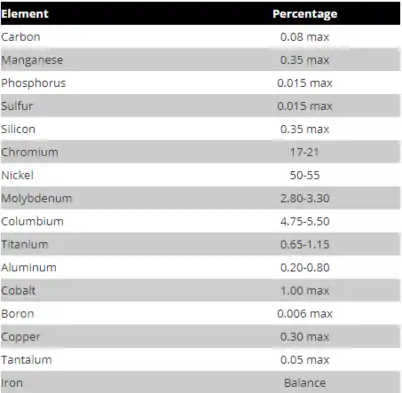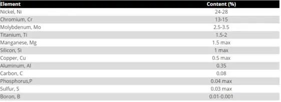 عناصر آلیاژی به کار رفته در در این آلیاژ در کروم نیکل و مولیبدن مشابه با برخی از فولادهای ضدزنگ آستنیتی میباشد. مقاومت به خوردگی این آلیاژ در دماهای بالا به خوبی مقاومت به خوردگی آن در دماهای پایین میباشد. مقاومت به اکسیداسیون در این آلیاژ در صورتی که به صورت پیوسته عملیاتی باشد تا دمای ۸۱۶ درجهٔ سانتی گراد و در صورتی که متناوباً کارکند تا دمای ۹۸۲ درجهٔ سانتی گراد در مقدار بالایی قرار دارد.