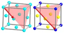 - گاماپریم ('γ): این بخش یک فاز بین فلزی بر پایه نیکل به همراه آلومینیم و تیتانیوم است که ساختار بلوری مکعبی وجه پر(FCC) دارد.[7] جهت ایجاد این فاز، اتمهای نیکل در وجوه مکعب و اتمهای آلومینیم یا تیتانیوم در لبههای مکعب قرار میگیرند.[6] این فاز یک وضعیت ناپایدار بین دمای ۶۰۰ تا ۸۵۰درجه سانتیگراد دارد که در آن 'γ به ساختار بلوری HCP تبدیل میشود.[9] برای موارد با دمای کمتر از ۶۵۰درجه سانتیگراد فاز "γ میتواند برای افزایش استحکام فعال شود.