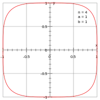 | منحنی شکلی شبیه مستطیل با لبههای گرد پیدا میکند. در نقاط (±a, 0) و (0, ±b) انحنا برابر صفر است. | ![]() ابربیضی با n = 4, a = b = 1 |