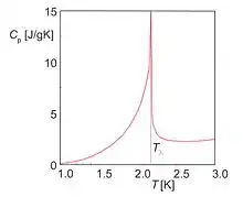 نمودار ۲- تغییرات ظرفیت گرمایی هلیم ۴ با دما را نشان میدهد این شکل ظرفیت گرمایی He-4 مایع در فشار بخار اشباع به عنوان تابعی از دما است. نقطهٔ اوج در T = 2.17 K نشان دهنده انتقال فاز است.