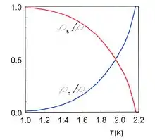 ۲- یک جز مثل ابر شاره رفتار میکند با ویسکوزیته و آنتروپی صفر نسبت چگالی مربوط ρn/ρ وρs/ρ, با (ρn (ρs چگالی شاره نرمال (ابر سیال) و ρ (چگالی کلی) به دما وابستهاست و این وابستگی در شکل ۳ نمایش داده شدهاست.[6] با کاهش دما، درصد چگالی ابر شاره از صفر در Tλ به یک در صفر کلوین میرسد. زیر ۱ کلوین هلیم کاملاً به صورت ابرشاره است.