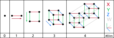 ۱-اگر این نقطه به اندازهٔ یک واحد به سمتی، حرکت کند، یک پارهخط پدید میآورد. پارهخط یک اَبرمکعب با بعد یک است. (به بیان دیگر پارهخط نوعی فوقمکعب در فضای است.)