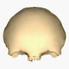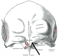![]() استخوان پیشانی. سطح بیرونی. (ابرومیان در پایین استخوان دیده میشود.) | |
