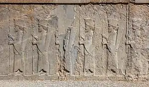 ![]() سنگنگارههای نقش برجستهٔ نیمرخ از صف سربازان شاهنشاهی هخامنشی که بر دیوارهٔ یکی از پلکانهای اصلی کاخ آپادانا حجاری شدهاند. | |