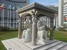 دولت جمهوری اسلامی ایران در ژوئن ۲۰۰۹ به عنوان نشانی از پیشرفت علمی صلحآمیز ساختمان-مجسمهای به شکل چهارتاقی که ترکیبی از سبکهای معماری و تزئینات هخامنشی و اسلامی در آن دیده میشود را به دفتر سازمان ملل متحد در وین هدیه داد که در محوطهٔ آن در سمت راست ورودی اصلی قرار داده شدهاست. در این چهارتاقی مجسمههایی از چهار فیلسوف ایرانی خیام، ابوریحان بیرونی، زکریا رازی و ابوعلی سینا قرار دارد.[45]