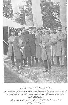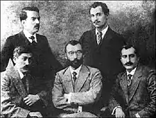 ![]() نشسته از راست: باقرخان رامشگر؛ سیدحسین طاهرزاده؛ درویشخان. ایستاده از راست: عبدالله دوامی، ابوالحسن اقبال آذر |
