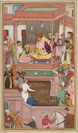 ![]() ابوالفضل علامی در حال ارائه اکبرنامه به اکبر یکم | |