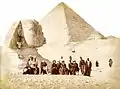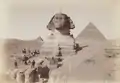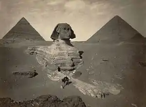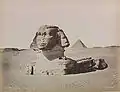 نگارهای از ابوالهول بین سالهای ۱۸۶۷ و ۱۸۹۹ میلادی. در زمان ثبت نگاره هنوز بخشی از بدنهٔ ابوالهول زیر شنها مدفون بوده است. دو هرم بزرگ از اهرام مصر در پشت سر تندیس ابوالهول مشاهده میشوند.