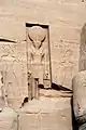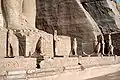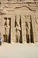 چهار مجسمه عظیم (به ارتفاع ۲۰ متر) از او در طرفین ورودی معبد وجود دارد. این معبد رو به شرق است و Re-Horakhty یکی از خدایان خورشید درست در بالای فرورفتگی سردر ورودی قرار دارد. یکی از ویژگیهای این معبد، چگونگی سامان دادن جهت قرارگرفتن آن است که باعث شده دو بار در سال، در ۲۲ فوریه و ۲۲ اکتبر، پرتوهای خورشید دقیقاً به داخلیترین مکان مقدس معبد بتابد و مجسمههای چهار خدای نشسته در آن مکان که عبارتند از Path, Amun-Re, Ramesses II و Re-Horakhty را کاملاً درخشان و روشن کند. ساخت این چهار مجسمه ۲۰ سال به طول انجامید.