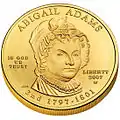 برنامه نخستین همسر تحت برنامه سکه های 1 دلاری ریاست جمهوری، به بخشی از وزارت خزانه داری ایالات متحده اجازه می دهد تا نیم انس از سکه های طلای 10 دلاری، و کپی های برنزی را برای احترام به همسران اول ایالات متحده صادر کند. سکه ابیگیل آدامز در 19 ژوئن 2007 منتشر شد و فقط در ساعاتی فروخته شد. تصویر او در حالیکه مشهورترین نامه خود را به جان آدامز می نویسد، در پشت سکه زده شد.[8]