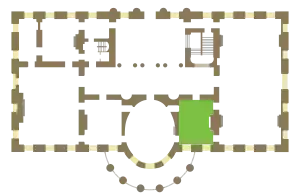 اتاق سبز به شکل سنتی با رنگهای سایهای سبز رنگآمیزی و تزئین شدهاست، ابعاد اتاق در حدود ۲۸ فوت و دارای ۶ در است که به طرف کراسهال، اتاق شرقی، سردر جنوبی و اتاق آبی باز میشود
