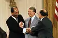 سادات، کارتر و مناخیم بگین پس از امضای قرارداد صلح کمپ دیوید، در حال مصافحهٔ همزمان به سال ۱۹۷۸ در اتاق شرق