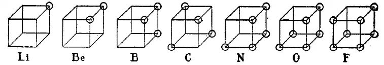 اتم مکعبی (به انگلیسی: Cubical atom) گونهای مدلسازی اولیه از اتم بود که در آن الکترونهای اتمها و مولکولهای غیر قطبی در گوشههای یک مکعب فرض میشدند. این مدل در سال ۱۹۰۲ بوسیله گیلبرت لوویس پیشنهاد شد. شکل زیر این مدل را برای اتمهای گروه دو جدول تناوبی نشان میدهد: