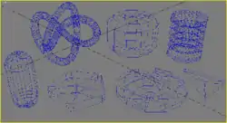 گره چنبره (بالا چپ)، استوانه پخ (بالا وسط)، شلنگ (بالا راست)، کپسول (پایین چپ)، چندوجهی حجیم (پایین دومی از چپ)، مخزن نفت (پایین دومی از راست) و منشور (پایین راست)