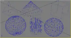 جعبه (بالا راست)، مخروط (بالا وسط)، هرم (بالا چپ)، کره (پایین چپ)، لوله (پایین وسط) و کره ژئو (پایین چپ)