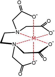 در شیمی کوئوردیناسیونی عضوی از خانواده لیگاندی آمینو پلی کربوکسیلیک اسیدها میباشد. معمولاً با یک یون فلزی از طریق دو آمین و چهار کربوکسیلات خود پیوند برقرار میکند. بسیاری از ترکیبات کوئوردیناسیونی حاصل با ساختار هندسی اُکتاهدرال منطبق هستند.[13] بسیاری از کمپلکسهای به دلیل تشکیل یک پیوند اضافی با آب (کمپلکس هفت کوئوردیناسیونی) یا جابجایی یکی از بازوهای کربوکسیلات با آب دارای ساختارهای پیچیده تری هستند. کمپلکس آهن (III) EDTA هفت کوئوردینه است.[14] اولین کارها برای توسعه EDTA توسط جرالد شورازنباخ در دهه ۱۹۴۰ انجام شد.[15] EDTA کمپلکسهای به ویژه قوی با Mn(II), Cu(II), Fe(III), Pb(II), Co(III) تشکیل میدهد.[16]