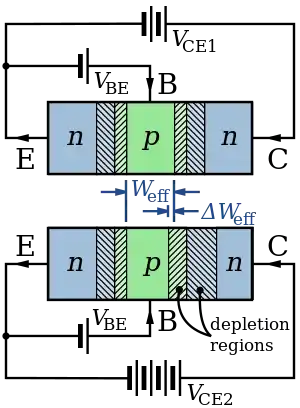اگر یک دیود نیمههادی در بایاس معکوس بایاس شود، عرض ناحیه تخلیه (لایه سد) نسبت به حالت بایاس مستقیم یا بدون بایاس، بیشتر میشود. در یک ترانزیستور BJT نیز به منظور عملکرد صحیح ترانزیستور (ناحیه فعال)، دیود بیس-کلکتور همیشه در بایاس معکوس قرار دارد؛ بنابراین عرض لایه سد دیود بیس-کلکتور افزایش مییابد. همانطورکه در شکل ۱ دیده میشود، لایه سد (قسمت هاشورخورده) در دیود بیس-کلکتور به درون هر دو لایه بیس و کلکتور نفوذ میکند اما از آن جایی که به هنگام ساخت ترانزیستور، پهنای ناحیه بیس را کمتر از ناحیه کلکتور انتخاب میکنند لذا افزایش عرض لایه سد باعت هرچه کمتر شدن پهنای ناحیه بیس میشود اما تأثیر زیادی بر روی عرض ناحیه کلکتور ندارد. اگر باز هم ولتاژ معکوس بیس-کلکتور افزایش یابد، لایه سد تمام پهنای ناحیه بیس را احاطه میکند و سبب میشود که الکترونها از ناحیه امیتر مستقیم وارد ناحیه کلکتور شوند.