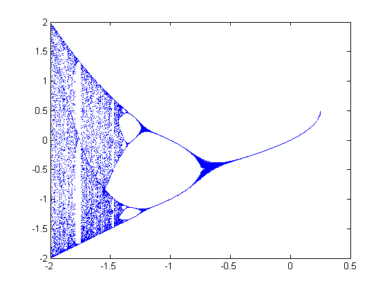اگر مجموعه مقادیری که x در طول عملکرد سیستم به خود میگیرد را نسبت به c رسم کنیم، شکل بدست آمده یک فراکتال (برخال) خواهد بود: