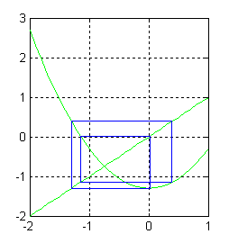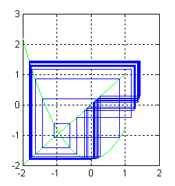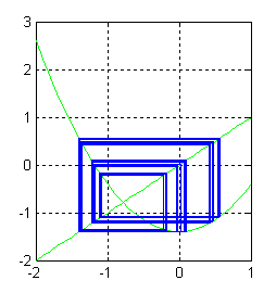 برای اینکه نتیجه عملکرد سیستم فوق را بتوانیم بهتر درک کنیم از نموداری به این شرح استفاده میکنیم. ابتدا تابع را رسم کرده و خط را نیز روی آن میکشیم. روی نمودار، مقداری اولیهای برای در نظر میگیریم. مقدار با رسم یک خط عمودی از این عدد تا نمودار بدست میآید. برای بدست آوردن نقطه بعدی باید مقدار قبلی y را به جای مقدار فعلی x بگذاریم. این کار با رسم یک خط افقی از نقطه برخورد قبلی تا نمودار انجام میشود. شکلهای زیر با در نظر گرفتن و به ترتیب، از راست به چپ، رسم شدهاند: