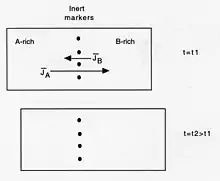 این آزمایش برای مواد جامد و همچنین مایعات غیرقابل حل در بکدیگر مورد استفاده قرار میگیرد. فرض کنید که نفوذ توسط مکانیزم جای خالی است بهطوریکه جریان ماده با یک جریان برابر و خلاف جابجایی همسان است.[4]
