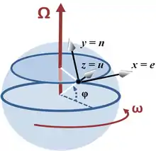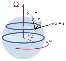سیستم مختصات در عرض جغرافیاییφ، با محور xها به سمت شرق، yشمال و z به سمت بالا (که به صورت شعاعی از مرکز کره به سمت بیرون میباشد). مکانی را روی کره در نظر میگیریم که حول محور شمال میچرخد. سیستم مختصات محلی با محور افقی x در سمت شرق، y به سمت شمال و محور عمودی Z به سمت بالا میباشد. بردار دوران، سرعت جابجایی و شتاب کوریولیس در این سیستم مختصات محلی عبارت است از: (شرق(e)، شمال (n) و رو به بالا (u). هنگامی که دینامیک جو یا اقیانوس را در نظر میگیریم، سرعت عمودی بسیار کوچک است و اجزا عمودی شتاب کوریولیس نیز در مقایسه با شتاب g بسیار کوچک است. در این قبیل موارد فقط اجزا افقی (شرق و شمال) مورد نظر میباشد. محدودیت بالا برای مقاطع افقی عبارت است از (Vu=۰).