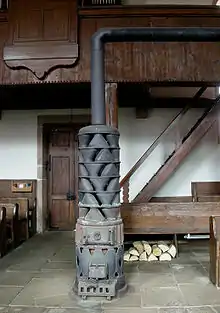 یک اجاق هیزمی که دارای یک مبدّل حرارتیِ بزرگ است