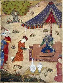 ![]() صحنه دریافت سفیر توسط تگودار. از کتاب تاریخ جهانگشای جوینی. سدهٔ ۱۴ میلادی | |||||