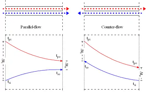 در تصویر سمت راست ،اختلاف دماهای ورودی و خروجی در داخل مبدل برای حرکت غیر هم جهت دو سیال در داخل مبدل و در سمت چپ برای دو سیال هم جهت نشان داده شده است