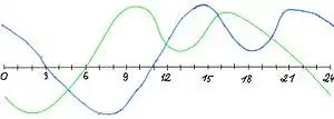 | مقایسه ریتم شبانهروزی استاندارد (سبز) و دیاسپیدی (آبی) | |