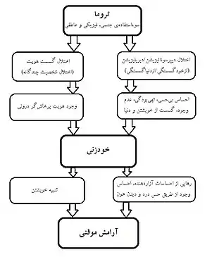 مدلی که توسط حبیب نوبخت نیارق و کارل اینگوار داله (2017)[6] برای تبیین ارتباط بین سابقهٔ تروما و سوءاستفادهٔ کودکی، علایم گسستگی (تجزیهای) و خودزنی پیشنهاد شدهاست، نشان میدهد چگونه احساس بیحسی، پوچی و تهیبودگی، که از نشانههای اختلال شخصیت مرزی است، فرد را به سمت خودزنی سوق میدهد.