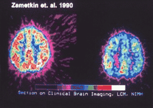 | Left: brain activity in healthy subjects. Right: apparent decreased brain activity in people living with ADHD. (Zametkin et al, 1990) | |