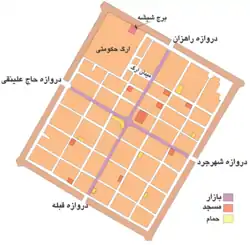 برای ساخت شهر ابتدا یک رشته قنات در خارج از محل شهر و از جنوب به شمال حفر شد که مظهر آن در جلوی دروازه جنوب شهر (دروازه قبله) قرار داشت و از آنجا سه قسمت میشد، یک قسمت برای ساکنین شرق شهر، یک قسمت برای ساکنین غرب و قسمت سوم به ارگ دولتی اختصاص مییافت. دیوارهای شهر برای دفاع به شکل برج و بارو و در یک مستطیل به طول ۸۰۰ متر و به عرض ۶۰۰ متر ساخته شد و دور آن به عرض ۸ متر خندقی حفر شد. در چهار سوی دیوارهای شهر، دروازههایی نصب شد. شکل مستطیل شهر به گونهای طراحی شده بود که جهت شهر به سمت قبله باشد. دلیل این امر استفاده خانهها از نور خورشید در زمستان و خنک بودن منازل در تابستان بود. عرض شهر به ۶ قسمت و طول آن به ۸ قسمت مساوی (به شکل شطرنجی) تقسیم شد و از میان هر قسمت کوچهای ۵ متری عبور میکرد. کوچههای میانی طول و عرض شهر به بازار اختصاص یافت که در طول ۴ بازار سقف زده شد. در قسمت شمال شهر ساختمان اداری ارگ حکومتی ساخته شد و همه امکانات رفاهی مانند حمام، آبانبار، مسجد، مدرسه و سقاخانه در همه نقاط شهر احداث شد. در قدیم فضای سبز شهر بسیار بود، طوریکه در پشت دیوار شهر تا شعاع چند کیلومتری باغهای انگور و ترهبار وجود داشت.[19]