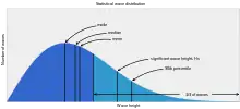 عموماً توزیع آماری ارتفاع تکموجها با توزیع رایلی تقریب زده میشود.[3] برای نمونه، اگر ارتفاع موج مشخصه ۱۰ متر باشد، از نظر آماری: