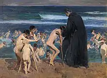 ابعاد کار بزرگ و ۲۱۰ سانتیمتر × ۲۸۵ سانتیمتر (۸۳ در ۱۱۲ اینچ) است. این نقاشی گروهی از کودکان برهنه بیمار و معلول را در ساحل مالواروسا در والنسیا به تصویر میکشد، از جمله برخی از آنها به دلیل فلج اطفال از عصا استفاده میکنند. آنها توسط راهبی با لباس سیاه از بیمارستان پناهندگی والنسیا در سن خوان دو دیوس به ساحل آورده شدهاند تا به عنوان اقدامی درمانی در آب دریا استحمام کنند. در پس زمینه، برخی از کودکان در دریا هستند.